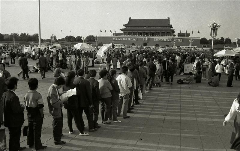 1992年,天安門廣場國營照像點前排隊等候照像的游客。 張居生