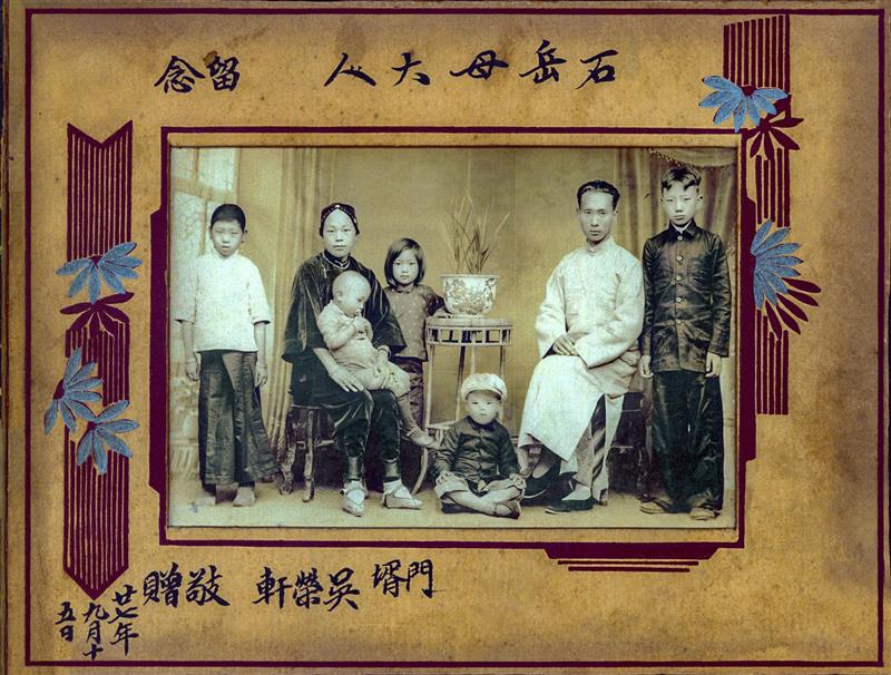 圖中的男主人吳榮軒老先生是云南省瀘西縣第一個照相人,妻子石氏(圖中女主人)十年前從外縣嫁到吳家,由于當時的交通(僅有馬幫)條件落后及家庭事務(wù)石老太太一直沒有回過娘家。岳母十分思念女兒一家,吳老先生自拍了一張全家福精心裝裱后寄給岳母以慰老人的思念之情。 民國27年 倪建斌