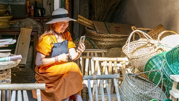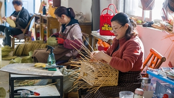 《六安竹編傳承人、全國“三八”紅旗手、安徽省勞動模范鄒紅在手工編織竹器工藝品》