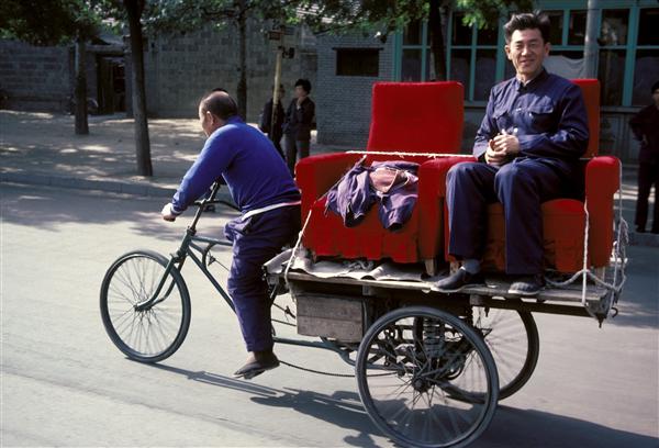 1984年11月,北京,一位居民坐在拖新沙發(fā)的三輪車上。Gamma-RaphoGetty Images/視覺中國
