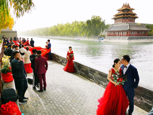 2020年10月31日,北京,金秋時(shí)節(jié),新人扎堆故宮角樓拍攝婚紗照。張居生 攝/視覺中國